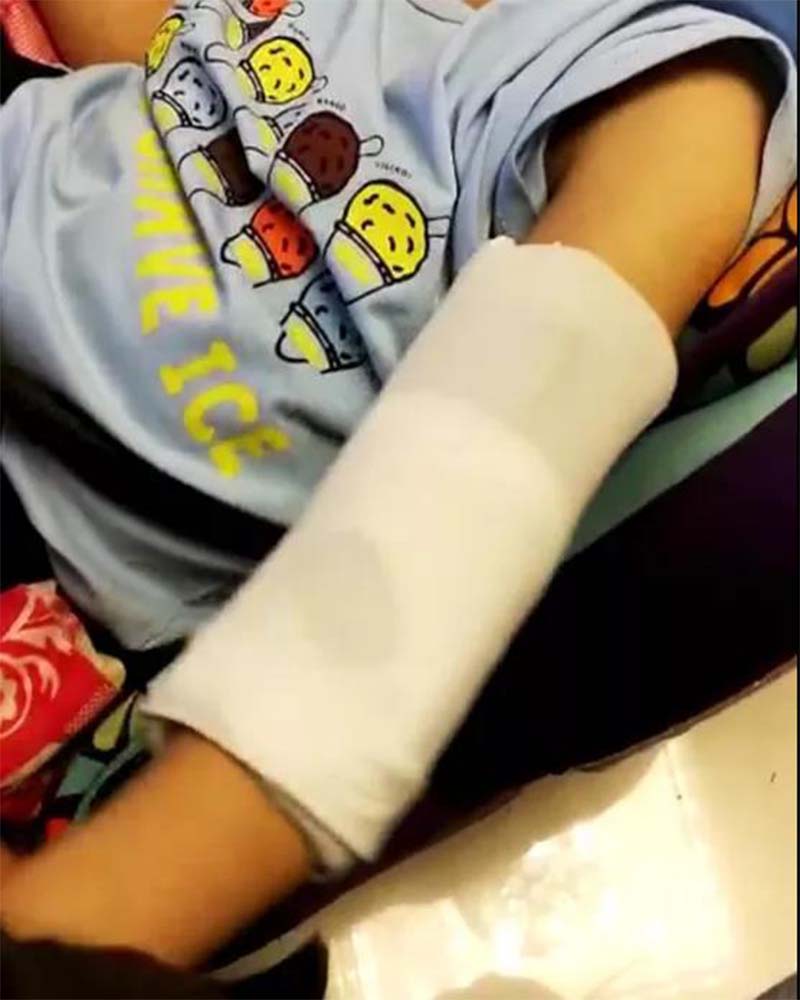 果宝的双臂被骨折用夹板固定,保证孩子的手远离面部,但他还是会不停挣扎,手臂上常常碰得青一块紫一块。而且如果束缚太紧则会导致血液流通不畅,想起有次孩子的小手被绑得发紫发冷的样子飞飞到现在仍心有余悸。可是束缚得太松会很容易被果宝挣脱,不仅无法阻止果宝自残,磕碰的现象也会更严重。类似这样的护理诀窍都是飞飞一点点试出来的,甚至包括服用症状缓解用药物的药量。