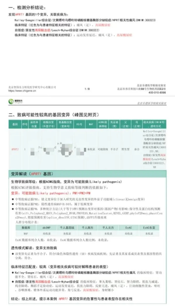 基因报告显示柒柒X染色体上HPRT1基因存在变异丨作者供图