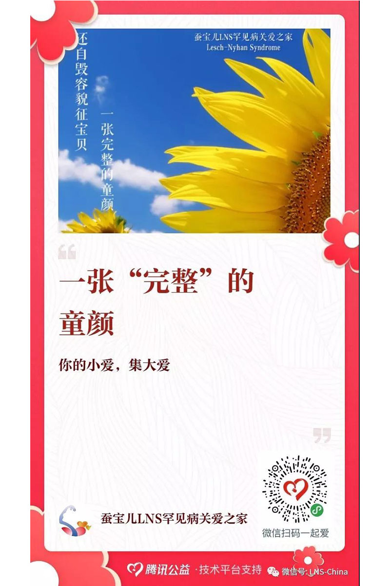 每一个LNS宝贝都不公平的来到世界上,但这并不意味者他们被视而不见!我们蚕宝儿LNS罕见病关爱之家旨在不断找寻LNS患儿,做大我们的群体,凝聚患儿集体的力量,让我们身影被看得见、让我们的声音被听得见!希望可以汇聚媒体、医务工作者、药企、科研机构等的力量,让LNS的诊断和治疗有些许突破,让我们的孩子少一些痛苦、享受到快乐的童年!