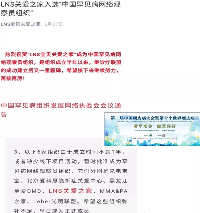 2019.6月:@ LNS 关爱之家入选“中国罕见病网络观察员” ;@LNS前往四川成都参加联谊患者组织“硬皮病关爱之家”病友大会,学习经验。