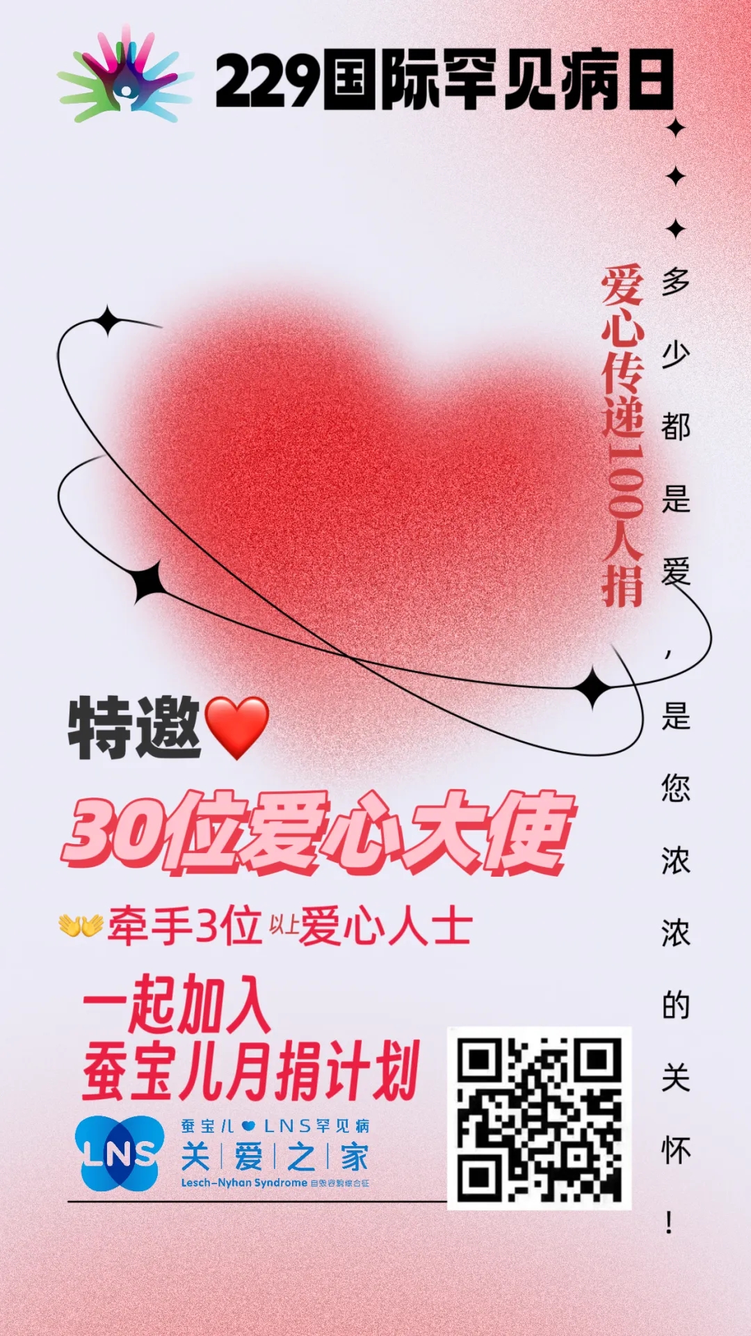 感谢来自患者家庭、诊疗与科研联盟的专家、还有社会爱心人士担任蚕宝儿爱心大使,在大家的共同努力下,关爱之家顺利完成了“爱心传递100人捐”的活动,并实现超过了100人成为“蚕宝儿月捐人”的目标。
