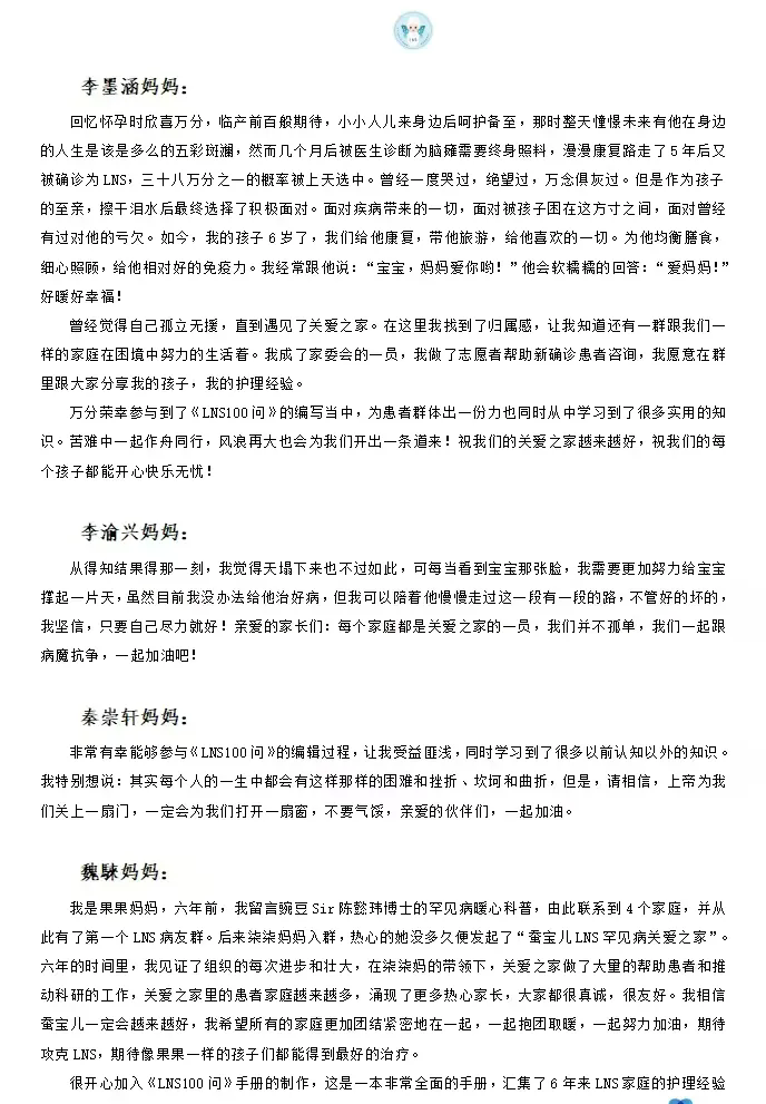 LNS目前没有特效药,所以几乎每位患者都需要24小时贴身照护,这是LNS家庭的痛点和最艰辛的过程。我们了解到多数家长(包括新确诊入群)不仅缺乏对疾病的正确认知、护理经验的匮乏,加上家庭和社会因素等影响,导致大部分中国LNS患者的生存质量普遍偏低。关爱之家成立近6年来,服务的家庭从最初的5个到目前接近100个,各种经验不断累积,为此,我们希望《LNS100问》是一个经验成果,是充分考虑患者家庭的需求,是多年来众多经验的总结汇编,期待能更好地帮助家庭提供参考和指导。