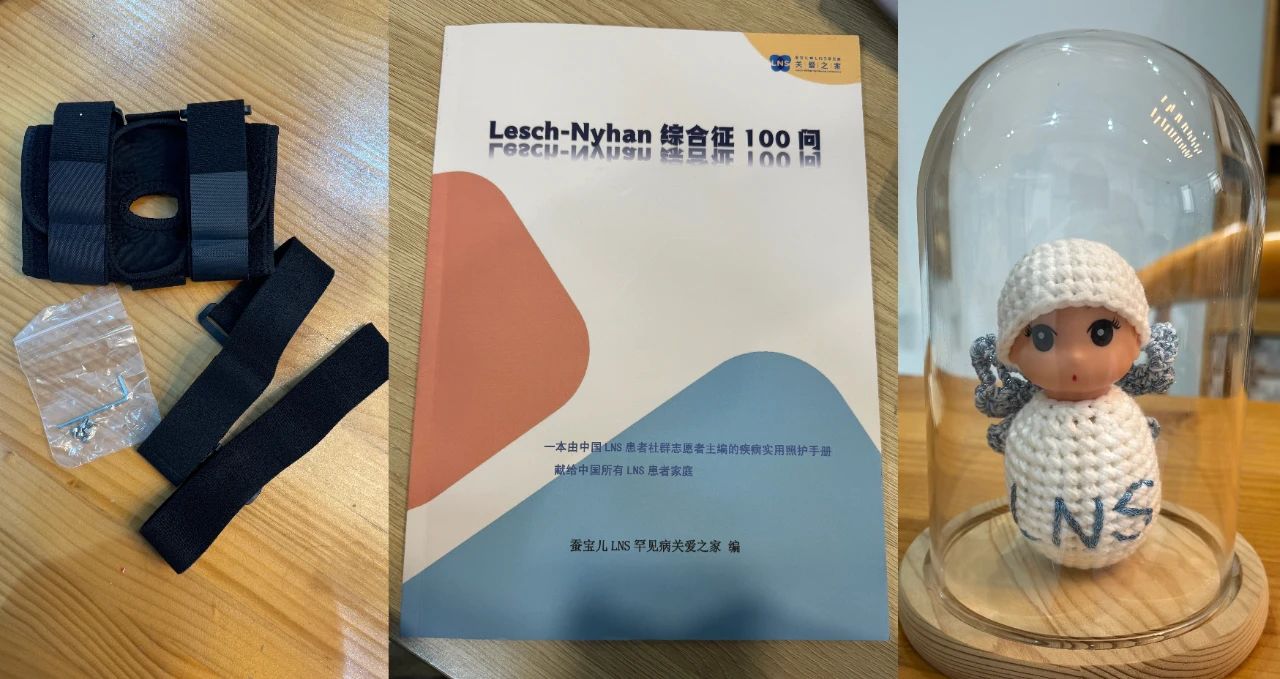 一进门,桌上摆着陈希手织的蚕宝儿吉祥物,书架上堆满由 LNS 患儿家长与医生们共同制定的、详细严谨堪称医学教科书的 LNS 诊疗与护理手册,仓库隔间全是黄倩跟厂家沟通多次为蚕宝儿们特殊定制的护具。