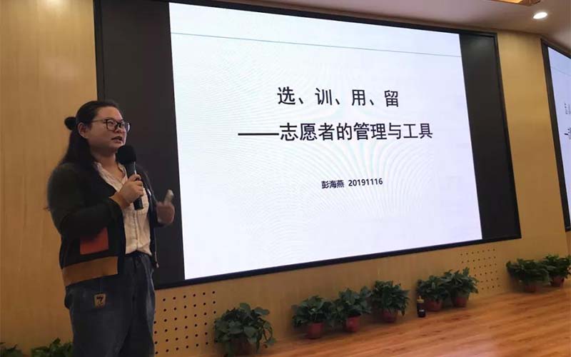 彭海燕主任围绕“选、训、用、留”四个关键字作为切入点,针对什么是志愿者、志愿者从何而来、为何而来、志愿者培训、登记、激励、对机构的认同度及意见反馈等多要素以实际案例与参会者进行互动探讨。