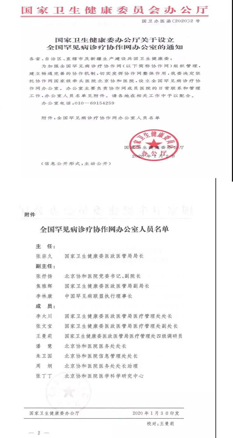 1月6日,国家卫生健康委官网公布《国家卫生健康委办公厅关于设立全国罕见病诊疗协作网办公室的通知》,决定依托协作网国家级牵头医院北京协和医院,设立全国罕见病诊疗协作网办公室。