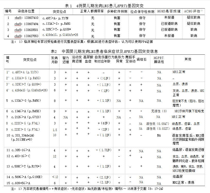 Lesch-Nyhan 综合征(Lesch-Nyhan Syndrome, LNS),又称自毁容貌综合征,是由于次黄嘌呤鸟嘌 呤磷酸核糖基转移酶(Hypoxanthine guanine phos⁃  phoribosyl-transferase,HGPRT)失活或缺乏所导致 的先天性遗传代谢病[1] 。HGPRT酶功能为催化次 黄嘌呤转换为次黄嘌呤核苷酸(肌苷酸,IMP),也 可将鸟嘌呤转化为单磷酸鸟苷(GMP)[2] 。HGPRT 酶的失活或缺乏会导致次黄嘌呤、鸟嘌呤以及磷 酸核糖焦磷酸的聚集。过多的次黄嘌呤和鸟嘌呤 通过黄嘌呤氧化酶转化为尿酸,致使患者表现为 高尿酸血症或尿症[3] 。由于脑组织中不存在自5- 磷酸核糖至尿酸的从头合成嘌呤核苷酸的路径, 嘌呤核苷酸只能通过 HGPRT 作用的补救路径合 成,因此HGPRT酶缺乏影响神经系统的生长发育[4]。HGPRT 编码基因 HPRT1 位于 Xq26.2-q26.3,LNS 患者多为男性,由女性携带者传递,属 X染色体 隐性遗传病(OMIM 308000),发病率为 1/555 556 ~  1/100 000[3,5-7] 。LNS具有广泛的临床表现,典型症 状包括高尿酸血症、精神发育迟缓、严重的运动 障碍、舞蹈手足徐动症 和 自我伤害行为,以及 HPRT1相关的痛风性关节炎、血尿[5,8-9] 。目前为止, 国内外学者在HPRT1基因已经发现超过400种致 病性突变,中国LNS患者已有报道,但此类患者婴 儿期特征的描述性研究甚少,或呈散发报道,临床 医生对婴儿期特点认识不足,从而延误诊断和治 疗。另外HPRT1基因型与婴儿期发病LNS表现型 的关系尚不清晰。因此,本文报道了4例婴儿期发 病LNS患者的临床与基因突变特点,结合国内外曾 报道的中国患者的相关资料,探讨婴儿期发病LNS 的临床特点,便于临床医生认识此类罕见病。