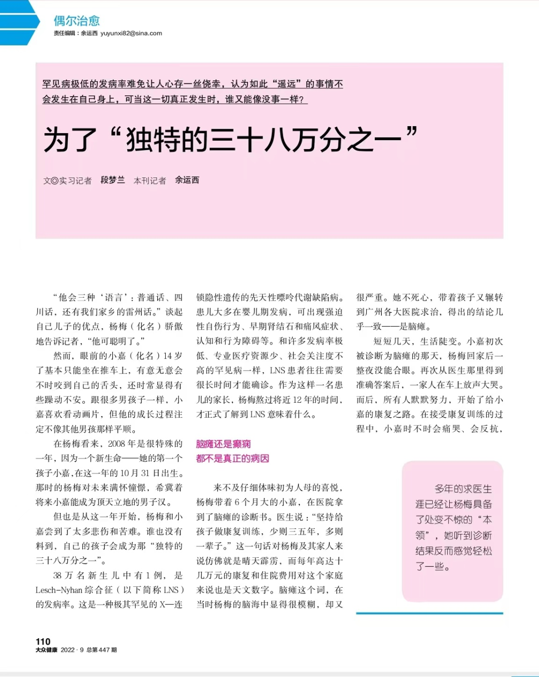 近期,LNS患儿家长佳乐妈妈接受《大众健康-偶尔治愈》栏目组的采访。在故事中,她道来了孩子患病经历和作为母亲的心路历程,虽然生活和照护孩子的极其艰辛,佳乐妈妈已久却以“像没事儿一样”坦然面对。目前,《为了独特的三十八万分之一》在已刊登在该杂志2022年第9期,总447期上。