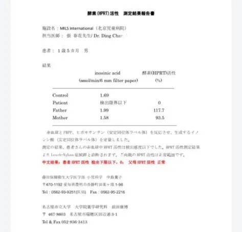 LNS是丁医生听说过、从未见过和确诊过的疾病。为谨慎起见,她托人在日本的名古屋市立大学为柒柒进行了次黄嘌呤-鸟嘌呤磷酸核糖转移酶活性检测,结果显示血液中该酶活性为0。这意味着,柒柒就是全球三十八万分之一的LNS患儿。
