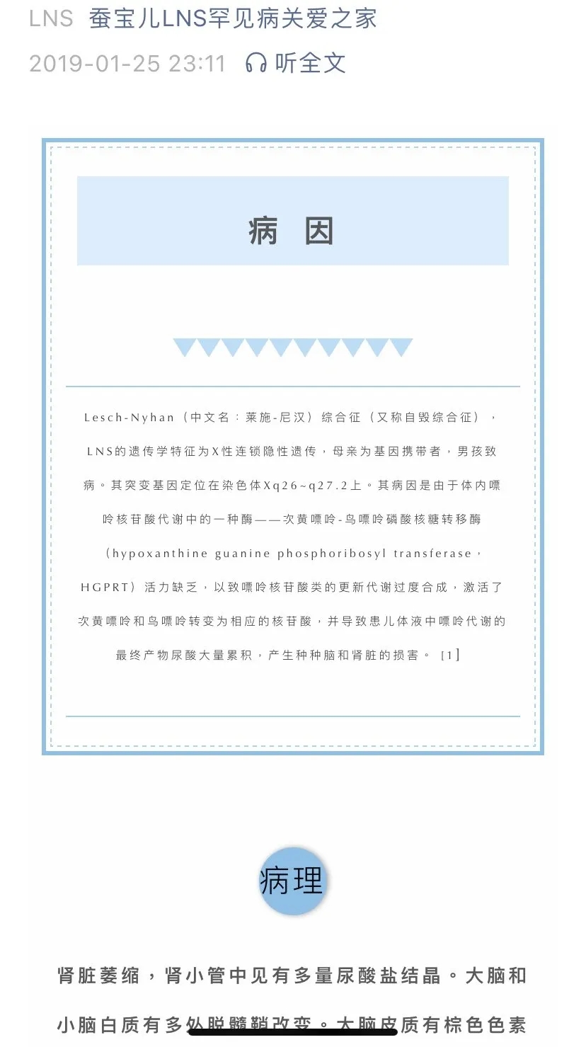 “内疚和自责”也许是每一个LNS患儿妈妈的内心独白,也许是每个把致病基因遗传给孩子的父母的内心独白。我们应该做好定期体检、孕前和孕期检查,努力保持健康的生活方式,但谁能保证我们的基因不发生变异呢?
