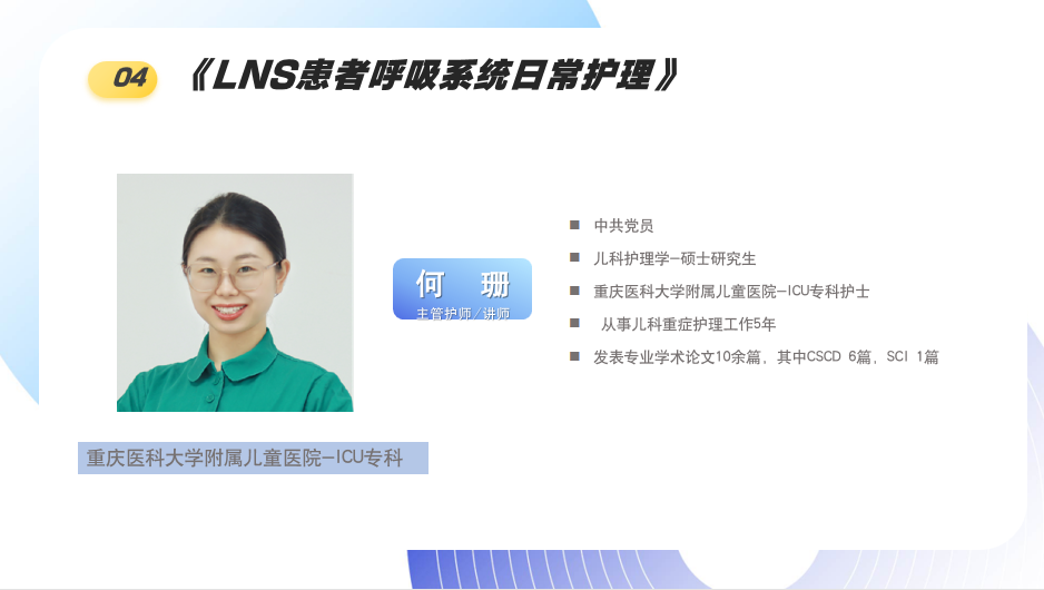 以下是第四期内容:重庆医科大学附属儿童医院-ICU专科主管护师/讲师何珊老师,为全体LNS患者家庭带来《LNS患者呼吸系统日常护理》的专题讲座。