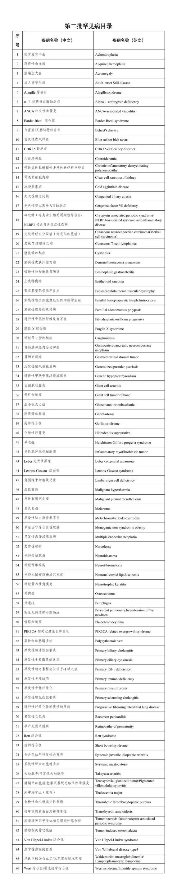 2023年9月18日,国家卫健委、科学技术部、工业和信息化部、国家药品监督管理局、国家中医药管理局和中央军委后勤保障部等六部门联合发布《第二批罕见病目录》,共纳入86种罕见疾病。加上2018年发布的《第一批罕见病目录》121种,目前,我国共有207种罕见病。