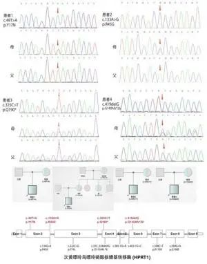 Lesch-Nyhan 综合征(Lesch-Nyhan Syndrome, LNS),又称自毁容貌综合征,是由于次黄嘌呤鸟嘌 呤磷酸核糖基转移酶(Hypoxanthine guanine phos⁃  phoribosyl-transferase,HGPRT)失活或缺乏所导致 的先天性遗传代谢病[1] 。HGPRT酶功能为催化次 黄嘌呤转换为次黄嘌呤核苷酸(肌苷酸,IMP),也 可将鸟嘌呤转化为单磷酸鸟苷(GMP)[2] 。HGPRT 酶的失活或缺乏会导致次黄嘌呤、鸟嘌呤以及磷 酸核糖焦磷酸的聚集。过多的次黄嘌呤和鸟嘌呤 通过黄嘌呤氧化酶转化为尿酸,致使患者表现为 高尿酸血症或尿症[3] 。由于脑组织中不存在自5- 磷酸核糖至尿酸的从头合成嘌呤核苷酸的路径, 嘌呤核苷酸只能通过 HGPRT 作用的补救路径合 成,因此HGPRT酶缺乏影响神经系统的生长发育[4]。HGPRT 编码基因 HPRT1 位于 Xq26.2-q26.3,LNS 患者多为男性,由女性携带者传递,属 X染色体 隐性遗传病(OMIM 308000),发病率为 1/555 556 ~  1/100 000[3,5-7] 。LNS具有广泛的临床表现,典型症 状包括高尿酸血症、精神发育迟缓、严重的运动 障碍、舞蹈手足徐动症 和 自我伤害行为,以及 HPRT1相关的痛风性关节炎、血尿[5,8-9] 。目前为止, 国内外学者在HPRT1基因已经发现超过400种致 病性突变,中国LNS患者已有报道,但此类患者婴 儿期特征的描述性研究甚少,或呈散发报道,临床 医生对婴儿期特点认识不足,从而延误诊断和治 疗。另外HPRT1基因型与婴儿期发病LNS表现型 的关系尚不清晰。因此,本文报道了4例婴儿期发 病LNS患者的临床与基因突变特点,结合国内外曾 报道的中国患者的相关资料,探讨婴儿期发病LNS 的临床特点,便于临床医生认识此类罕见病。